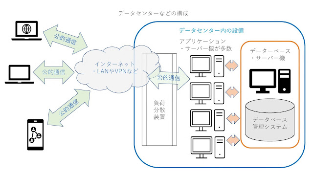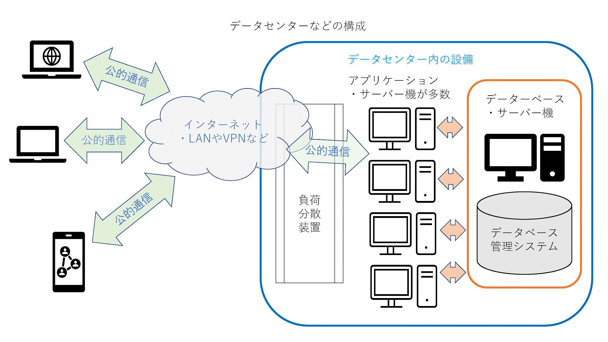 ユーザーのPCやスマホなどのクライアント端末から、インターネットを介して、データーセンター内の「負荷分散装置」に最初にアクセスする。