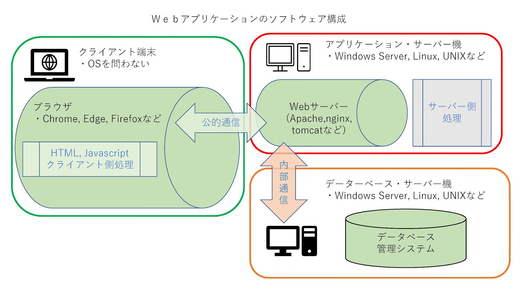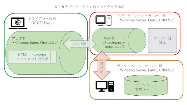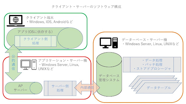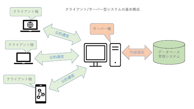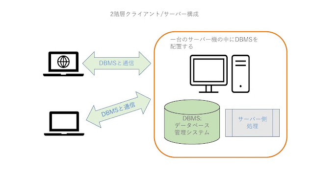 また、現代のシステムは大半がサーバー機にDBMS:データーベース管理システムを稼働しているので、「まず、クライアントとサーバーが通信し、次にサーバーとDBMSが通信する」という構成で構築されている。