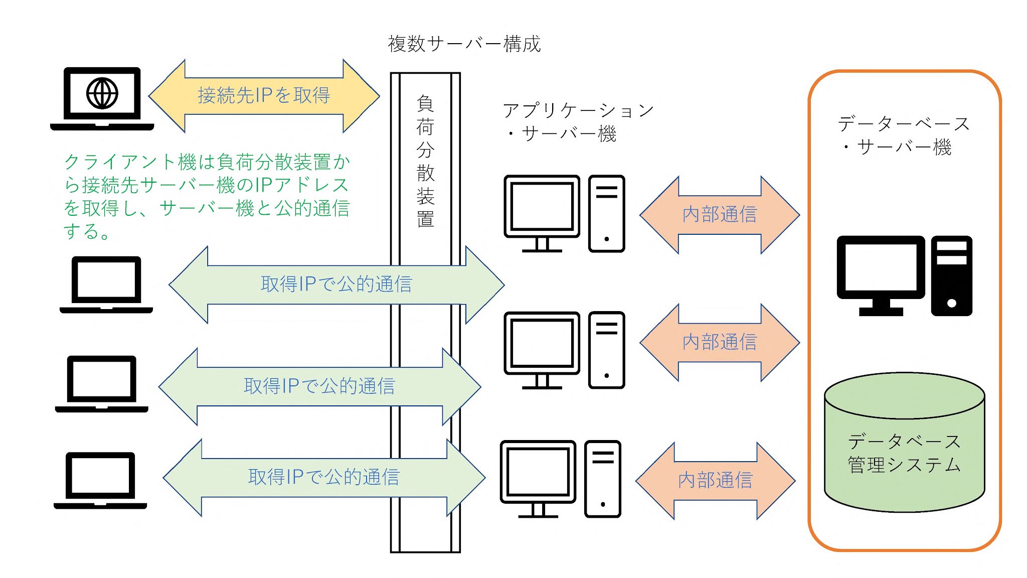 クライアント端末は負荷分散装置にドメイン名を渡し、返されたIPアドレスのアプリケーション・サーバー機へ「公的通信」で接続する。