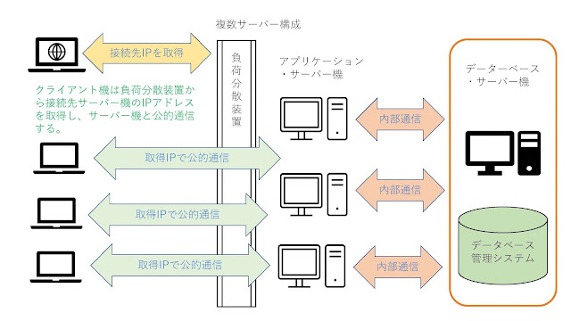 「複数サーバー構成」図は、一般的なデータセンターやクラウドコンピュータなどで使用されるクライアント・サーバーの構成である。