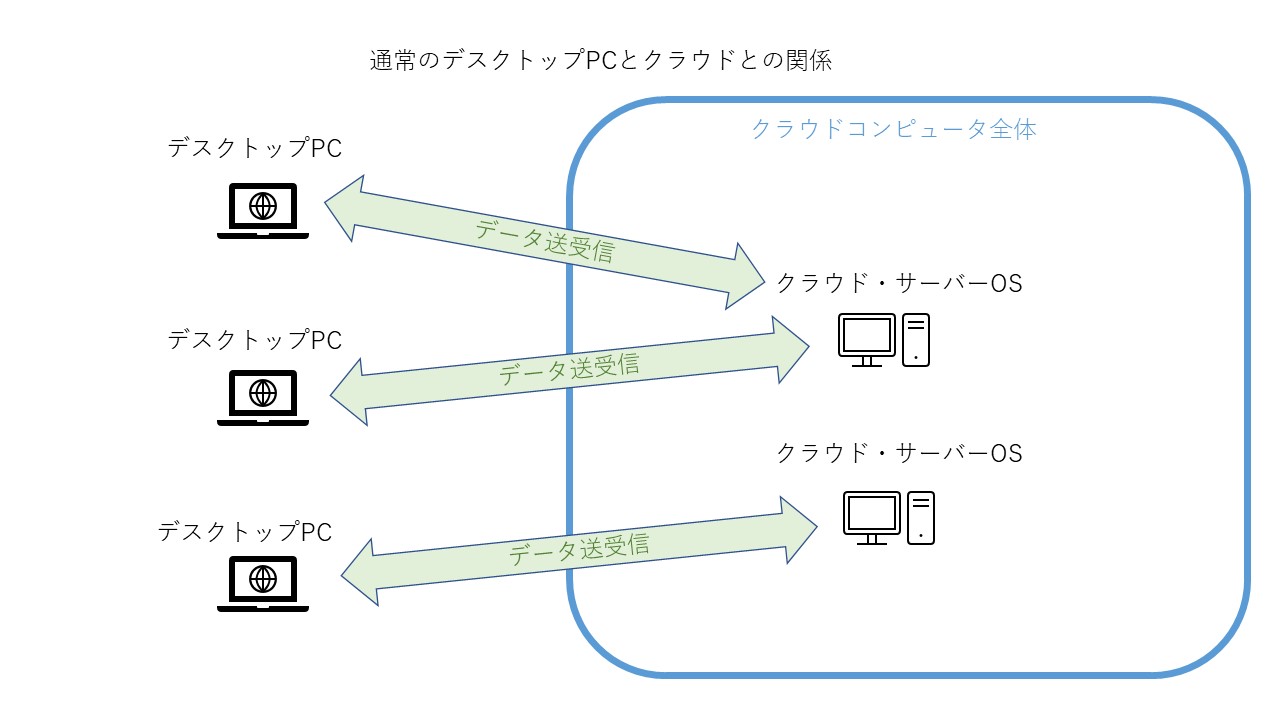 通常のデスクトップパソコンのOSはデスクトップパソコン自体にインストールされているが、クラウドPCはクラウドコンピュータ(サーバー側)に設置されるため、デスクトップパソコン上ではクラウドPCクライアントソフトウェアだけあれば、使用できる。